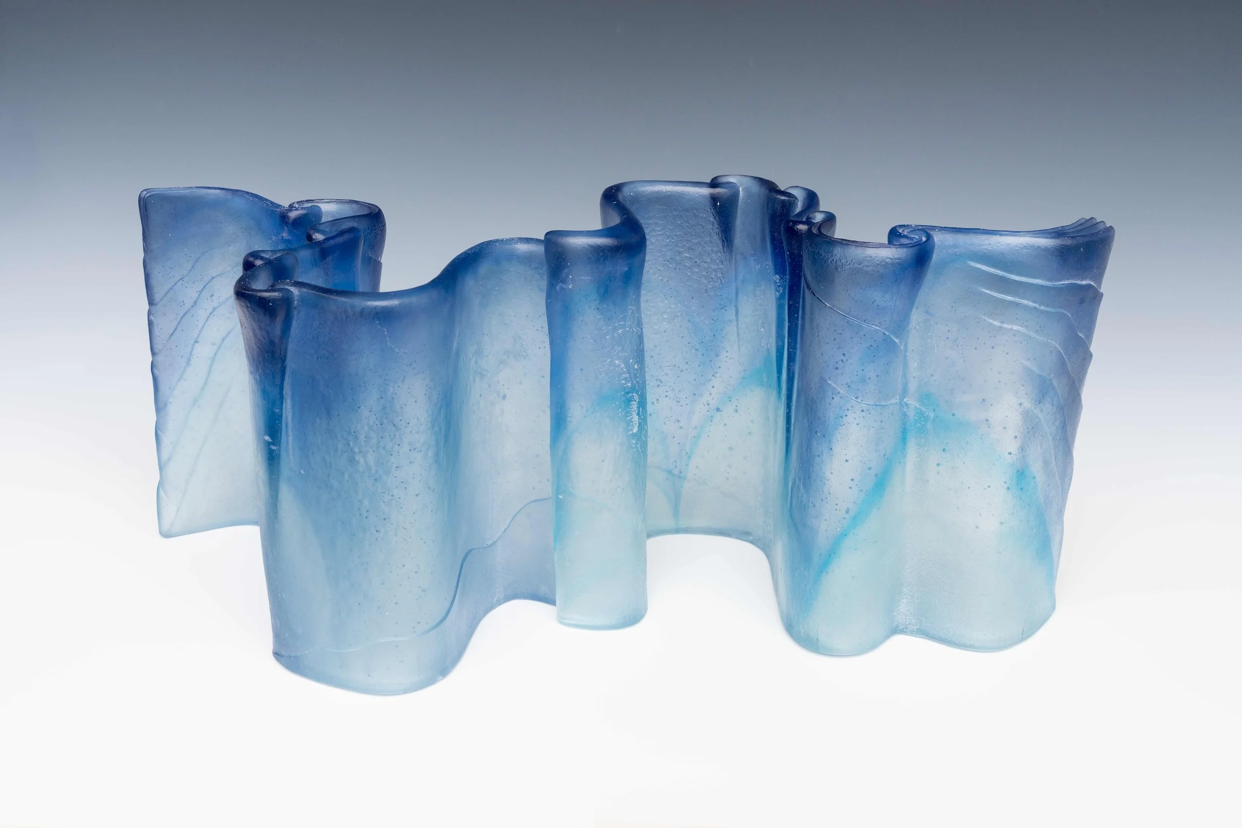 Space of Luminosity #3 - crystal, lost wax kiln cast, 2025, 9 x 24” x 7” comprised of two 12” long pieces, mixture of Steel Blue, Pale Steel Blue, Cobalt, Pale Cobalt, Aquamarine, Pale Aquamarine, Copper Blue, Pale Copper Blue - gaffer crystal - Available